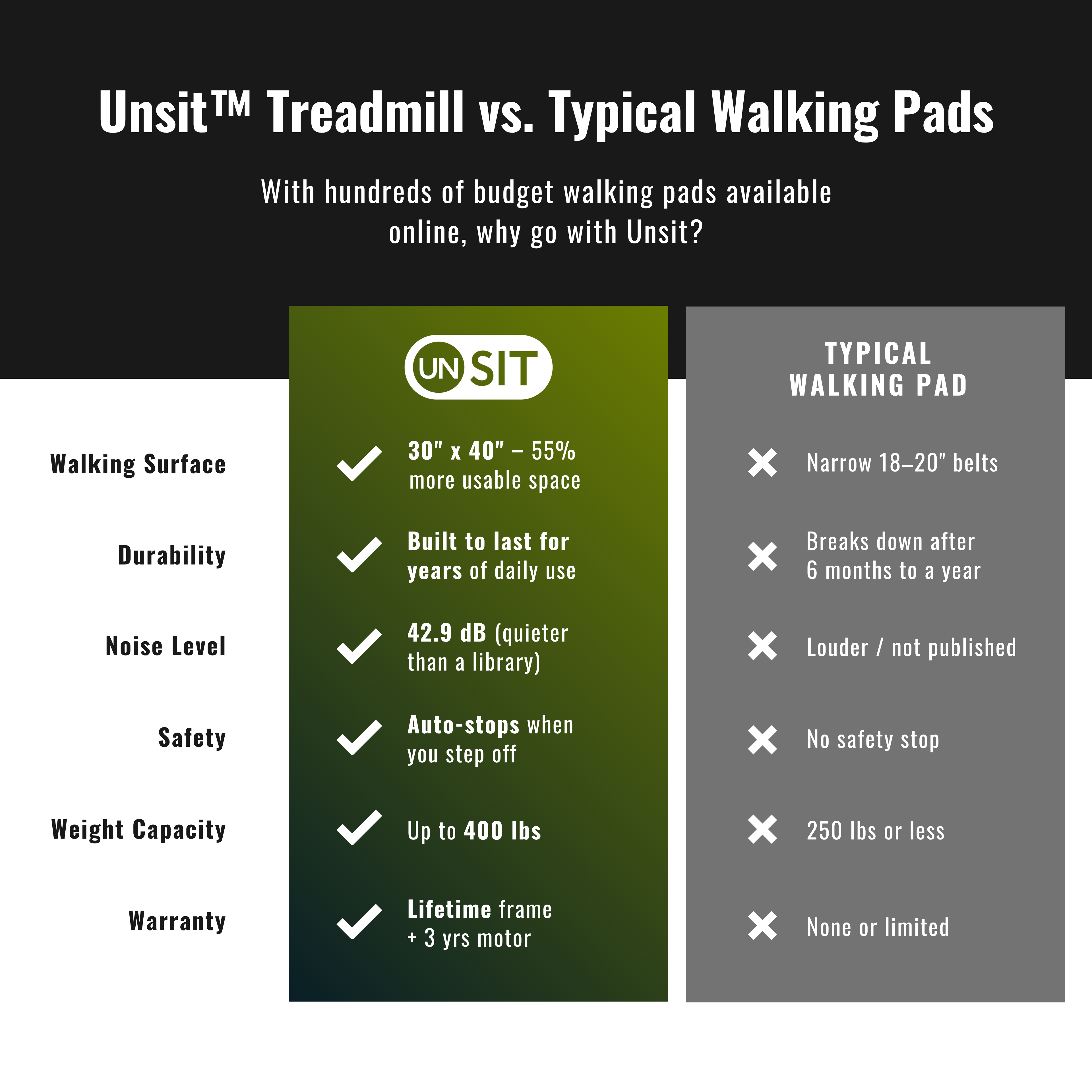 Absolutely not! Every part of the Unsit™ is designed for longevity — from its industrial-grade steel construction to its oversized walking deck and reinforced frame. Unlike lightweight home treadmills, it’s made to handle continuous use and higher weight loads day after day. That’s why it comes backed by a lifetime frame warranty and a reputation for durability that outlasts the competition.